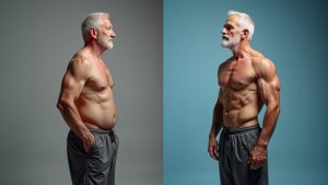 Before and after transformation of senior man showing strength training benefits for longevity and muscle health